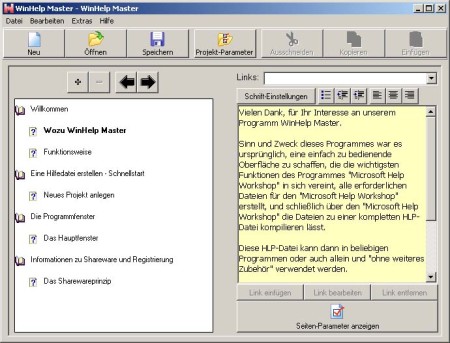 Dies ist ein Programm, mit dem Windows-Hilfedateien (HLP) auf einfache Weise erzeugt werden können. WinHelp Master benötigt dazu den \"Microsoft Help Workshop\", der allerdings in der Installation von WinHelp Master integriert ist. In einem Projekt werden einzelne Hilfeseiten und Kapitel arrangiert und die Inhalte werden erstellt. Die HLP-datei kann als Hilfe für eigene Programme verwendet werden (nach Freischaltung).