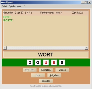 WordQuest ist ein einfaches Wortratespiel, bei dem es darum geht, aus den Buchstaben eines gegebenen Ausgangswortes möglichst viele andere Wörter (Teilanagramme) zu bilden und in die Wortliste einzutragen. Dazu wird eine riesige Wortliste mit ca. 97.000 Wörtern mitgeliefert. Sie können allerdings auch eigene Wortlisten verwenden. Das Spiel unterstützt Umlaute sowie Groß- und Kleinschreibung (bei eigenen Listen). Alternative Wortlisten stehen auf der Programm-Homepage zum Download bereit.