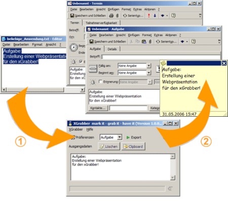 Speichern Sie Aufgaben, Termine, Notizen etc. aus jeder Quelle, wie z. B. Mails, Webformulare, Word-Dokumente, Excel-Sheets etc. mit nur einem Klick unter MS-Outlook ! Die Erfassung von Aufgaben, Terminen & Notizen ist nunmehr ein Klacks! Erfassen Sie persönliche Informationen mit nur einem Klick und sparen Sie Zeit und Geld! XGrabber arbeitet mit einem Klick und kann online geladen und erworben werden! Nie wieder Tippfehler.