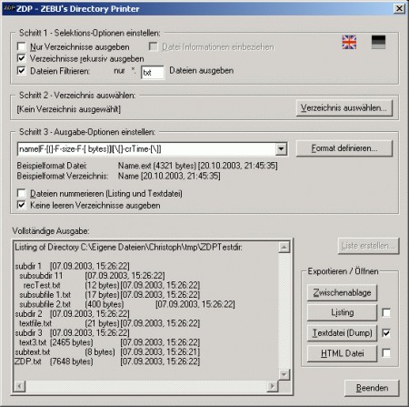 zdp dient dazu, den inhalt eines verzeichnisses auszugeben. dabei stehen diverse optionen zur verfügung.für die formatierung stehen vordefinierte formate bereit. beliebige zusätzliche formate können definiert werden.die erstellte verzeichnisliste kann via copy - paste oder via zwischenablage in beliebige andere programme übernommen werden (z.b. in word) oder als html datei und separierte text datei exportiert werden.verfügbar in dt und engl