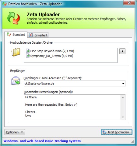 Kostenlos Große Dateien online versenden schnell und einfach per E-Mail. Dateitransfer und Austausch elektronischer Daten, mehrere Dateien und Ordner (samt Unterordnern und Dateien) an einen oder mehrere Empfänger per E-Mail versenden. Automatisch ZIP-komprimiert, Kennwort geschützt und mit Ablaufdatum.