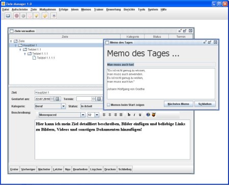 PC-Software für Selbstmanagement, Selbstcoaching und Zielmanagement. Mit dieser Software können Sie jetzt Ihre beruflichen und privaten Ziele effektiv managen und Ihre Fortschritte in Richtung Ihrer Ziele täglich festhalten. Die Software stellt Ihnen viele hilfreiche Instrumente zur Verfügung, die Sie auf Ihrem Weg zum Erfolg unterstützen.