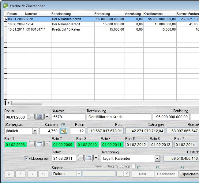 Kreditmanager mit Restschuldermittlung - Screenshot